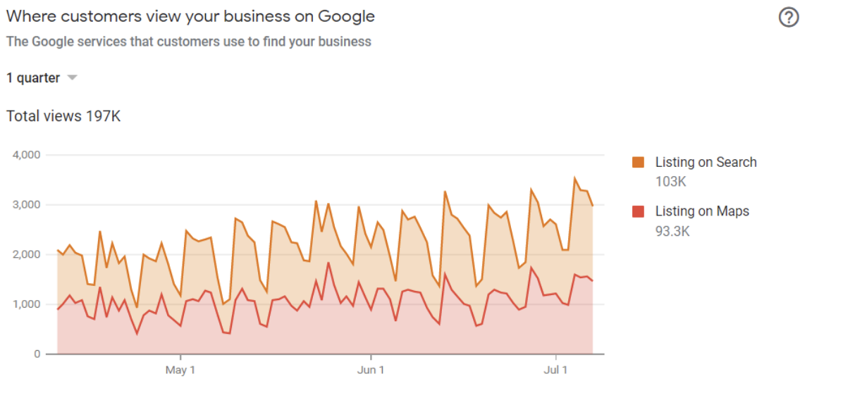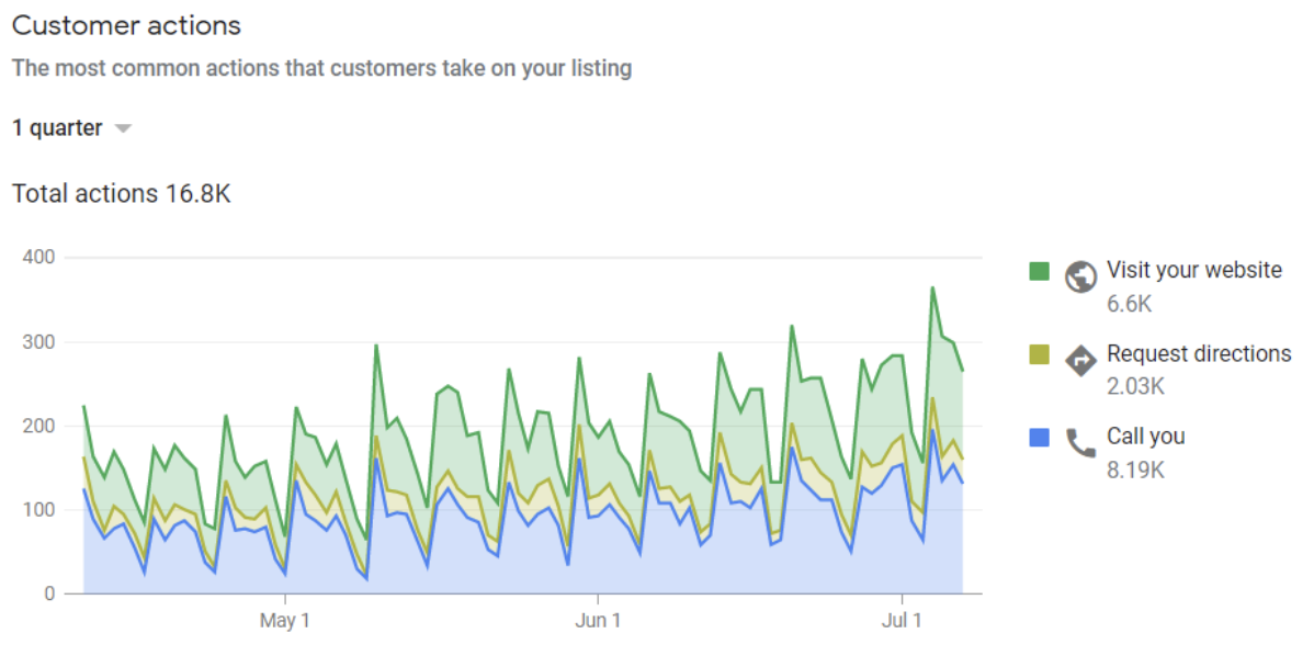 In the screenshot, you can see the results for Q1 of 2022 for Google My Business. In total, we received over 155 thousand clicks on the profile. Besides, we get 6.6K visits to the website, 2K requests for directions on maps, and 8.19K calls.